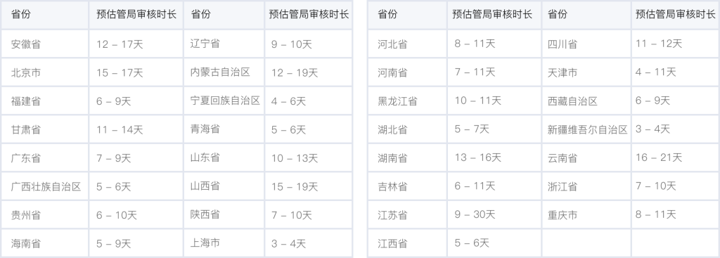 各個(gè)省管局預(yù)計(jì)審核時(shí)長,實(shí)際審核時(shí)長會(huì)根據(jù)備案場(chǎng)景有所不同,下表格僅供參考。詳情可查看 詳細(xì)規(guī)則。